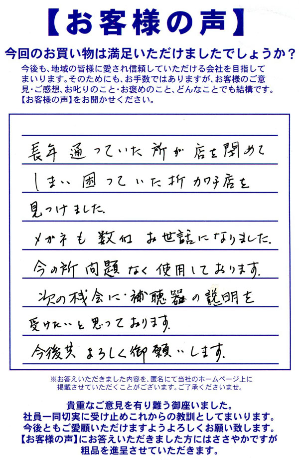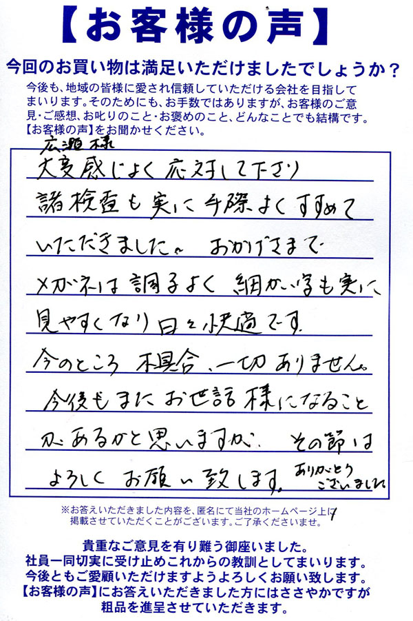 お恥ずかしながら初めて老眼鏡を作っていただきました。とても親切丁寧に説明していただき大変感謝しております。また視力検査の時も私の意見を聞きながら親身になって対応していただきました。最後に仕上がりも大大大満足いく仕上がりでとても良かったです。今後のメンテナンス・購入はカワチさんでお願いするつもりです。
