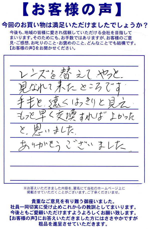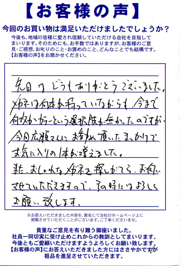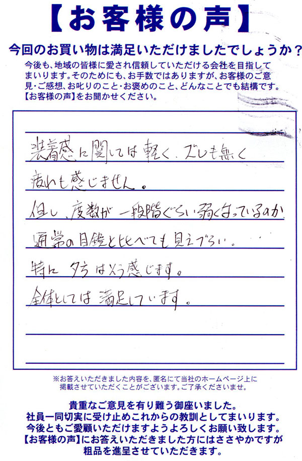 普段生活していて結構目が痛く感じる事が多くて目薬多様していたりして生活にストレスがかかっていたので、目に優しい物はないかとこちらに聞きにきたのが始まりでした。 自分でネット等で色が変わるものとかを調べては見たのものの、ある程度何かしらの宣伝バイアスがかかってる感じのものが多かったので、直接専門家に聞きにいくのが良いかなと思ったのもあります。 自分の目の状態だったりを見てもらうのも量販店とは違って細かく行なってくれたりして、自分の事でも知らなかった事も出てきたので楽しいのもありました。 店員さんも話しやすくてこちらの事を考えて答えてくれました。 自分は色が変わりつつ光を軽減してくれるレンズにして、遠近にもしてみました。 ちなみに初の遠近なので慣れるのに少しかかると言われたので慣れた頃にレビューしています。 値段はそれなりにはしましたが普段の生活のストレスが軽減されたり、目薬の使う量も大分減ったりと本当に満足してます。ありがとうございました。