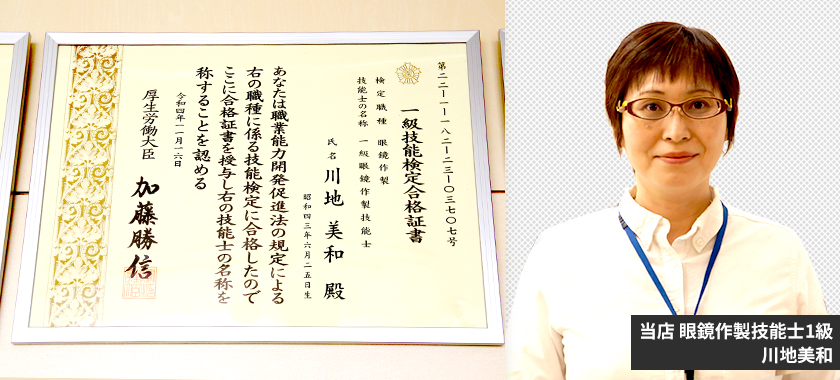 大切なのは、その眼鏡がお客様の目に正しく合っていること。当店では全スタッフが国家検定資格「1級眼鏡作製技能士」を保有しています。
